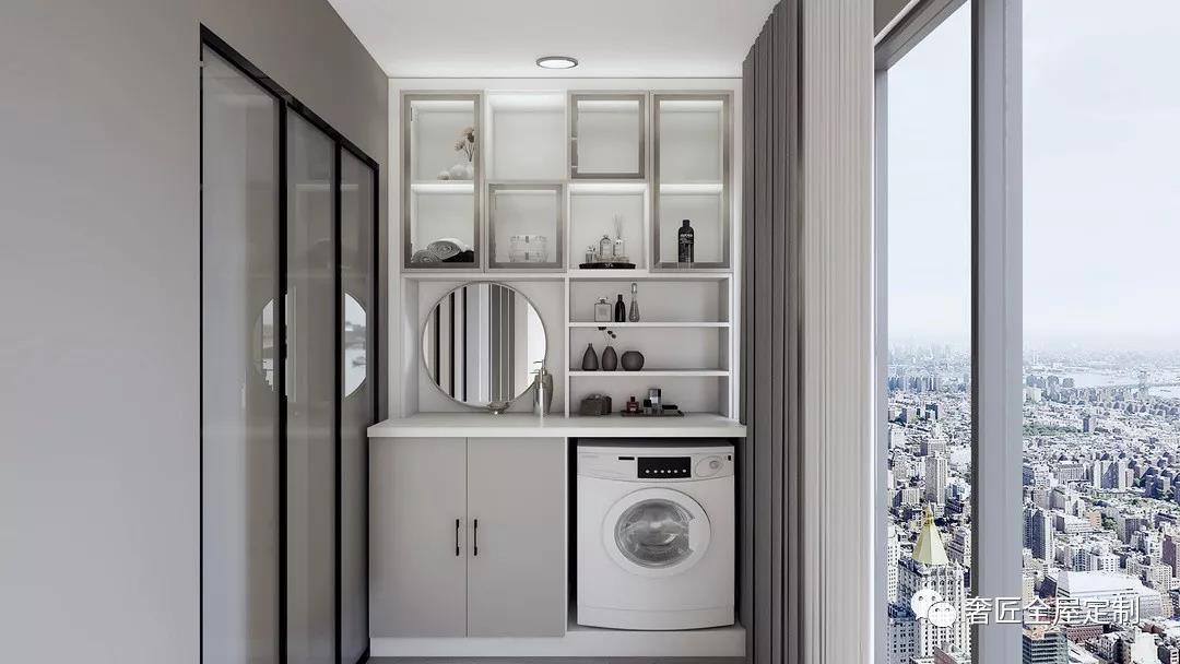 通常陽臺會做為洗衣區(qū),但單單放置一個洗衣機(jī)比較浪費空間,這個時候就可以把洗衣機(jī)上方的空間也利用起來,做成吊柜,加以隔板進(jìn)行分區(qū),方便收納放置洗衣粉、洗衣液等小件物品,也可擺放小盆綠植點綴空間。