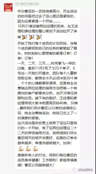 經(jīng)過鄰水店全體成員前期的充足準(zhǔn)備和每天辛勤的付出,在奢匠主動營銷戰(zhàn)隊的策劃幫扶與超強(qiáng)的執(zhí)行力下,此次開業(yè)活動收獲佳績,超額完成目標(biāo)。最終簽單50組,預(yù)計銷售額120萬!