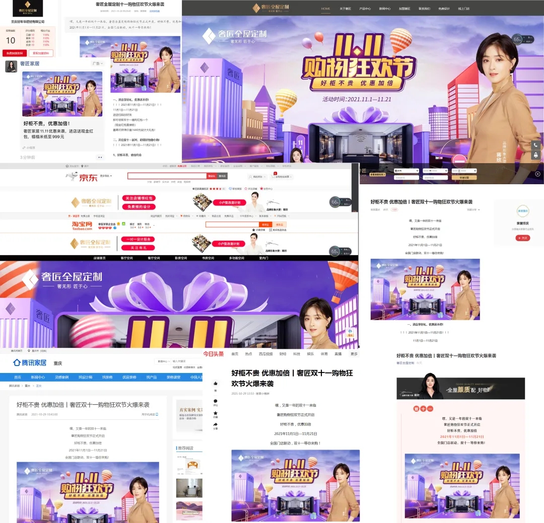 本次活動借助雙十一全民購物狂歡潮活動良機,集微信公眾號、京東、淘寶、抖音、小紅書等自媒體平臺全線引流宣傳,騰訊家居、慧亞家居等合作媒體同步造勢,提升品牌聲量,一展品牌勢力。同時,全面覆蓋目標群體,助力終端獲客。