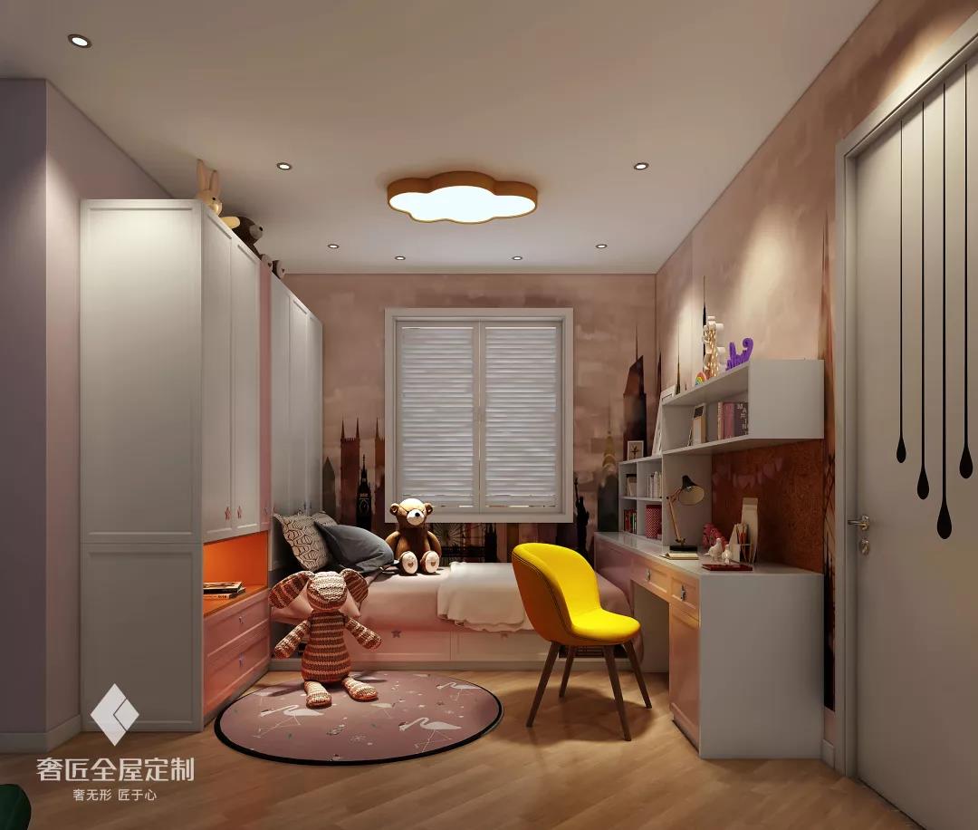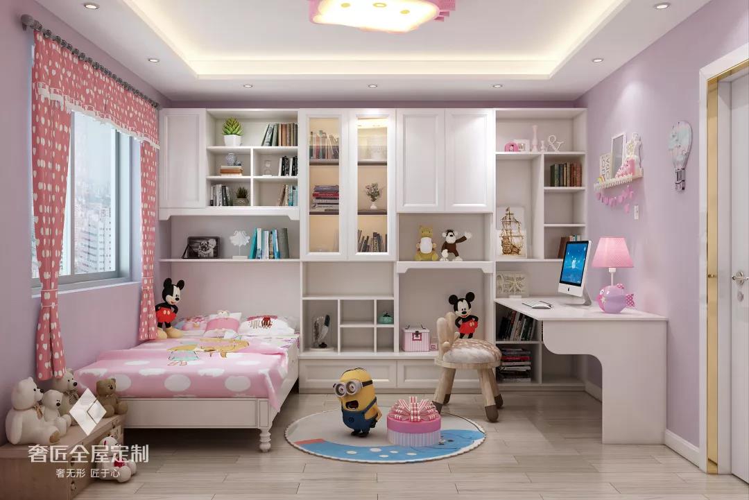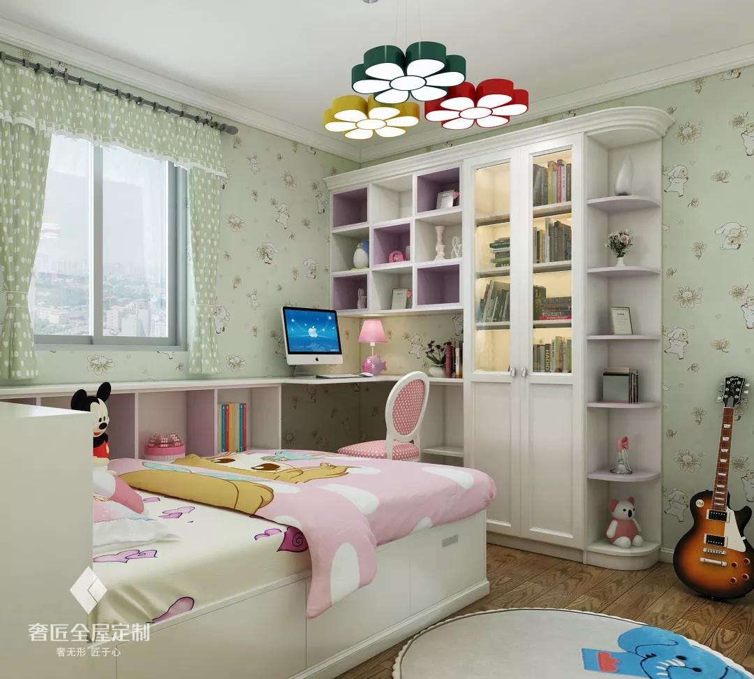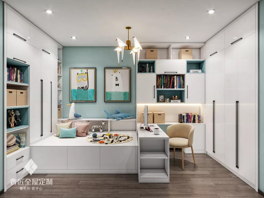 在兒童房中打造一個閱讀空間,將書柜、書桌與床上收納柜一體化設(shè)計,可以將孩子所有的書都展示出來,還可收納一些平時喜歡的小飾品。