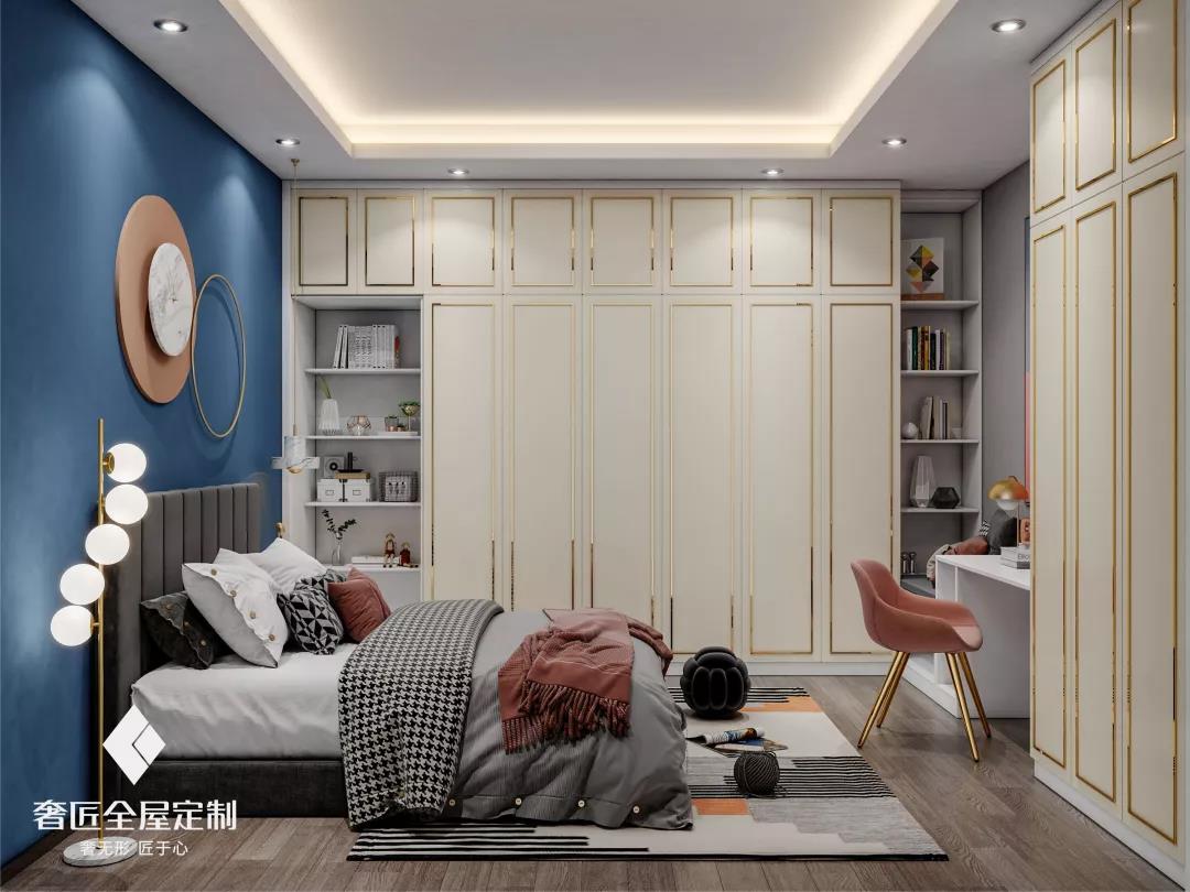 將書桌與置物柜連為一體,實現(xiàn)收納儲物、工作書寫、放置擺設品等多種功能,既保證了臥室整體美感,又節(jié)省不少空間,還可留出更多的自由區(qū)域,讓空間不顯擁擠。