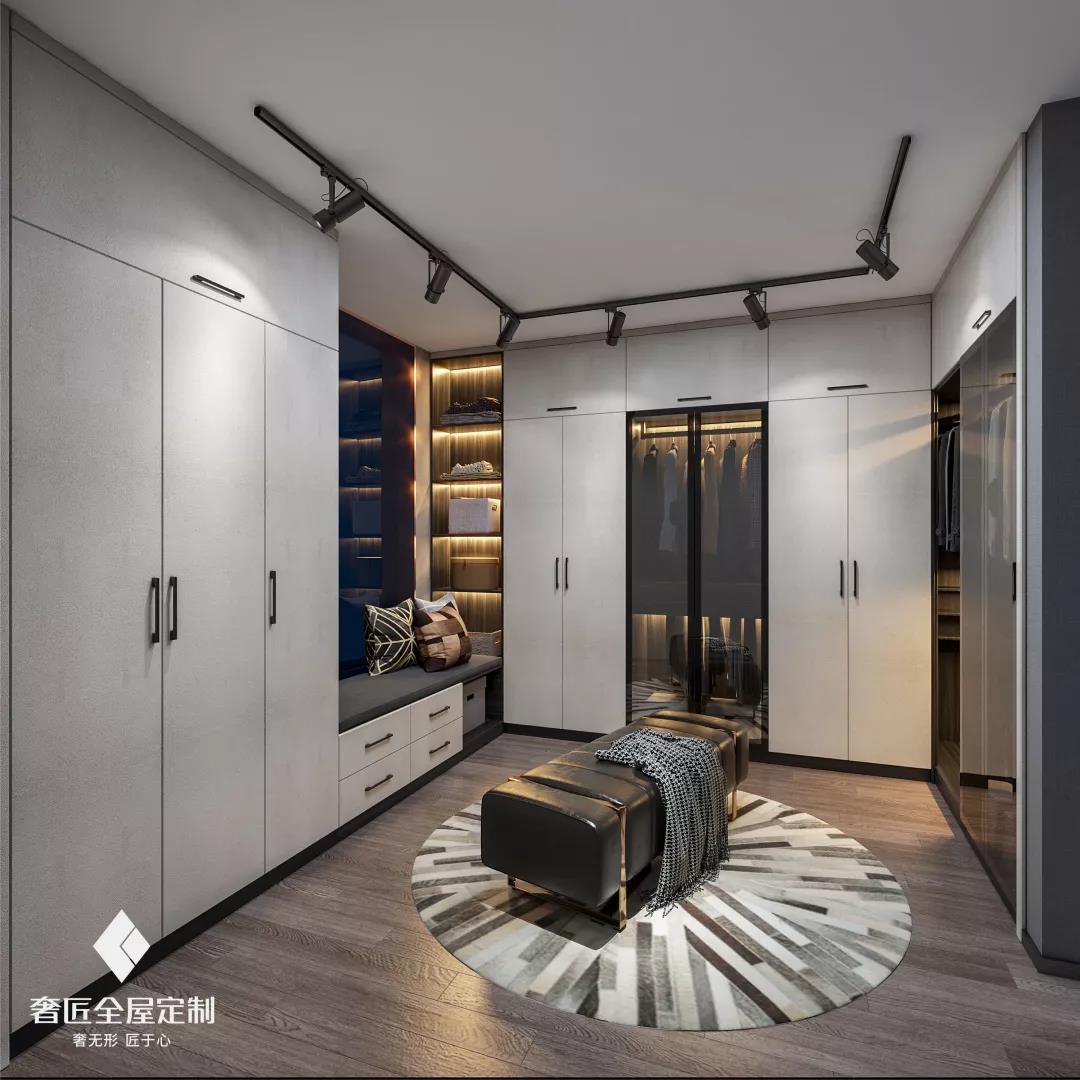 衣帽間的衣柜設計,利用L型墻體來實現(xiàn)衣柜的超強收納。