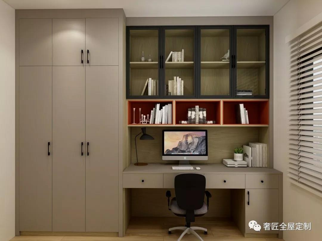 書房以柜子作為主體,采用蘇香桐+膚感灰兩種色調(diào),搭配鋁框玻璃柜門,凸顯書柜的超大內(nèi)容量,方便書籍分類存儲和取放。書桌、衣柜能夠滿足日常收納,衣柜可以作為多功能柜使用,不僅能夠存放衣柜,同時也可存放小孩的書本、書包等物品;書桌長而寬,能夠存放最近常用的書籍。而書房內(nèi)的原木地板給人以舒適優(yōu)雅之感,營造出良好的讀書、辦公氛圍。