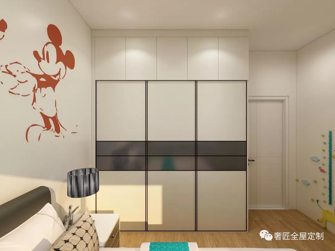兒童房的設(shè)計在元素和色彩的運用上更加多元化,雨絲白柜體的推拉門使用上更加輕巧安全,十分簡便,非常適合兒童使用。同時,深藍(lán)色條紋床頭燈、極具個性的格子枕頭、墻壁上的大幅米奇貼紙和富有童趣的身高測量貼都為大篇幅的白色增添了樂趣和童真。