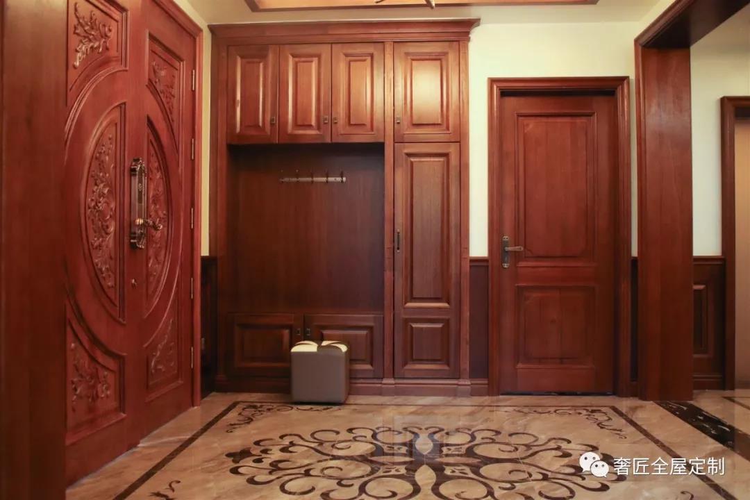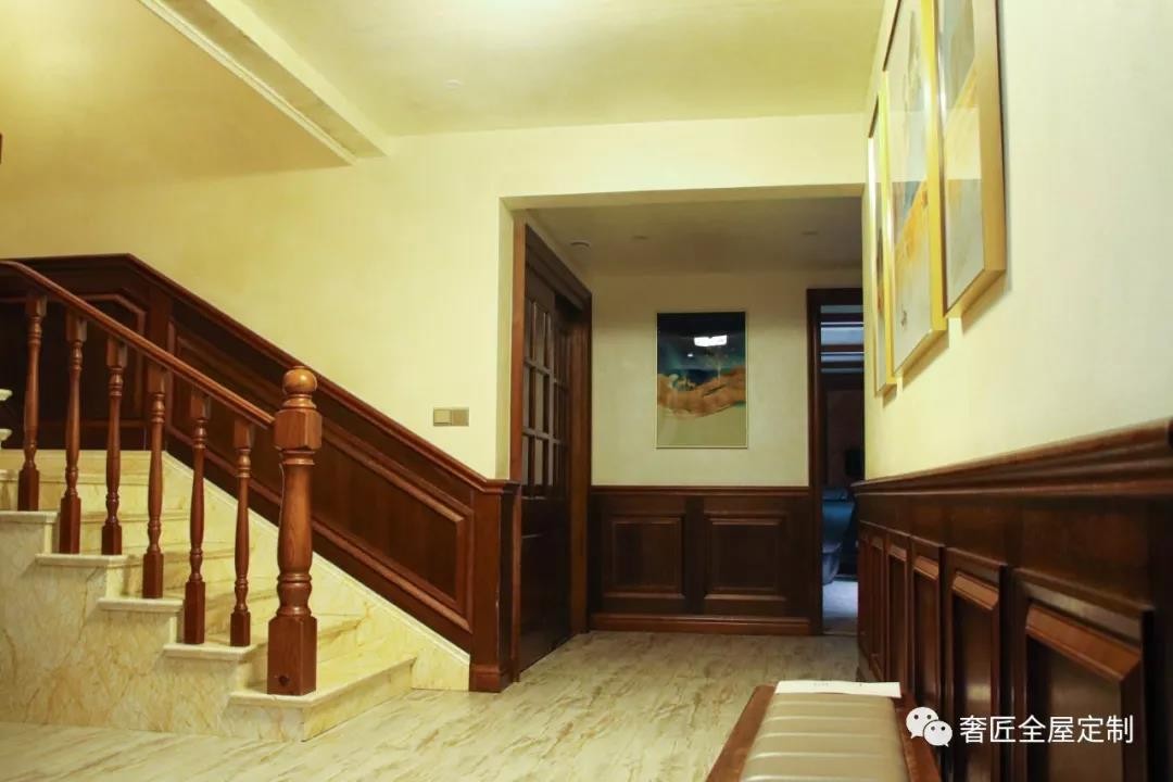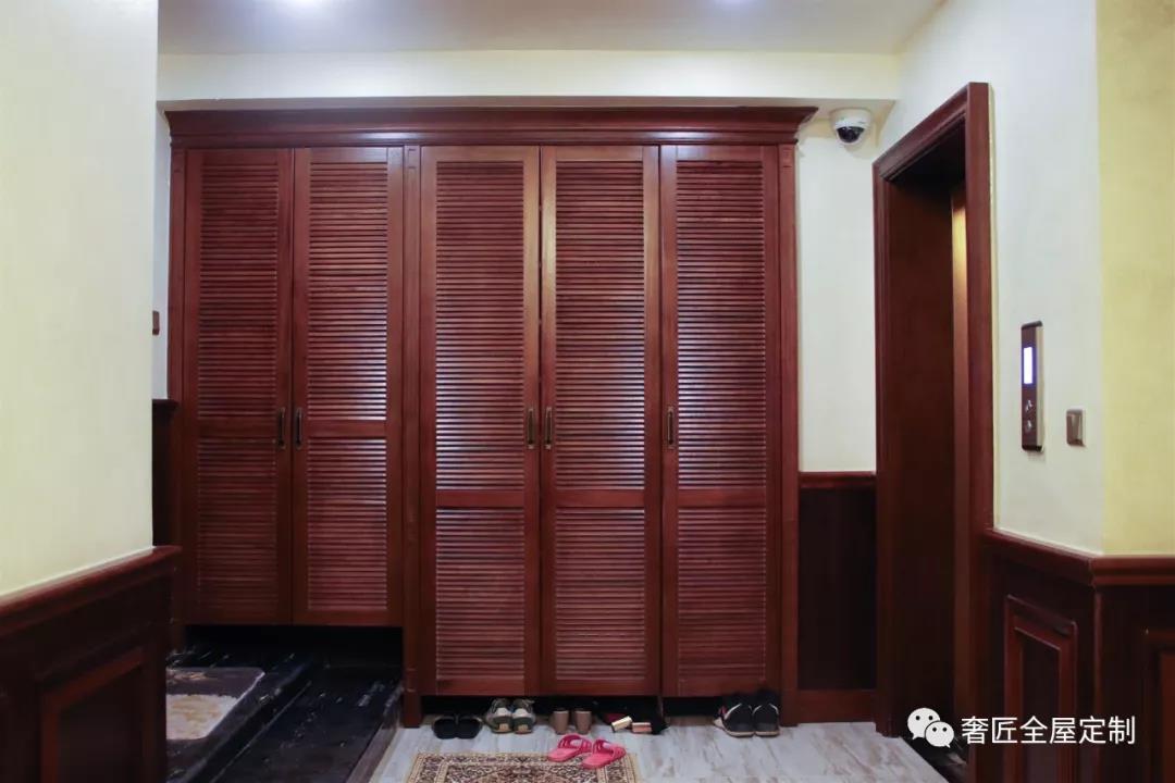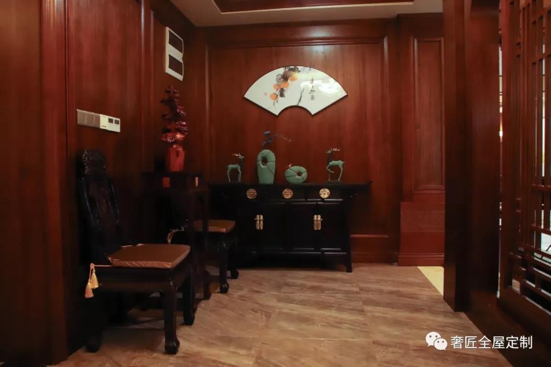 王女士家戶型比較大,三樓有一處室外露臺(tái),因此在三樓通往戶外露臺(tái)的玄關(guān)處放置一個(gè)鞋柜,可方便進(jìn)出時(shí)換鞋、掛衣和存放臨時(shí)物品,鞋柜以簡約的柜體造型為基礎(chǔ),增添了中式元素,使整體空間感覺更加豐富,大而不空、厚而不重,有格調(diào)又不顯壓抑。