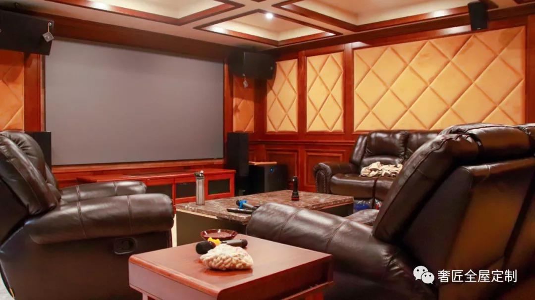 在家設(shè)影視廳,平時(shí)可作家用電影院,亦是獨(dú)立K歌房,位置設(shè)在負(fù)一樓,自帶隔音效果,完全不用擔(dān)心吵到家人休息。影視廳整體以深棕為基調(diào),背景墻采用軟包設(shè)計(jì),搭配黑色皮質(zhì)沙發(fā)作為局部點(diǎn)綴,將富有古韻的胡桃木與時(shí)尚軟裝家居完美結(jié)合,打造視覺上的平衡感,以此演繹大氣典雅的東方韻味。