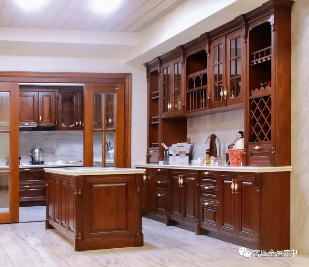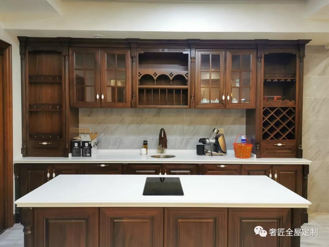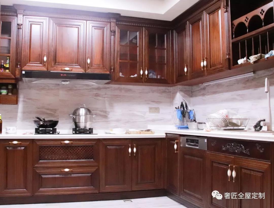 廚房的廚柜材質(zhì)運(yùn)用實(shí)木,搭配上廚房極具現(xiàn)代化的器具用品,形成從洗菜、切菜、炒菜的流暢動(dòng)線。棕色的廚柜,色彩上給人溫馨的感覺,大理石臺(tái)面與廚柜巧妙的融合及兼顧使用的設(shè)計(jì),讓廚房在使用過程中更加舒適便利。