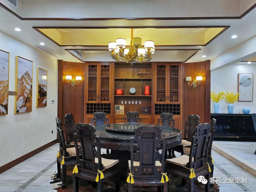 餐廳以整面墻作為餐邊柜和酒柜設(shè)計(jì),與用餐區(qū)的大圓桌相呼應(yīng),濃濃古韻中滲透了幾許現(xiàn)代氣息。餐邊柜線條層次分明,呈現(xiàn)出對(duì)稱設(shè)計(jì),具有較強(qiáng)的收納儲(chǔ)藏功能,還能裝飾餐廳,為生活提供便利的同時(shí),也是空間中一道美麗的風(fēng)景線。