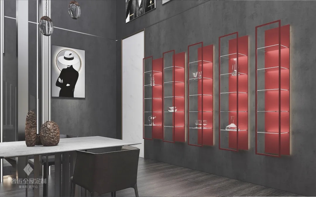 餐廳利用黑、白、灰打造極致理想空間,選取故宮高墻深處的那抹紅來進(jìn)行點(diǎn)綴,凹凸肌理質(zhì)感的爵士白、金色金屬穿插其中,天生自帶高級(jí)輕奢質(zhì)感的顏色與黑色交相輝映,東方的意蘊(yùn)令人一見傾心。華麗的水晶吊燈通過光影折射出來,每個(gè)角度都如夢般絢爛。