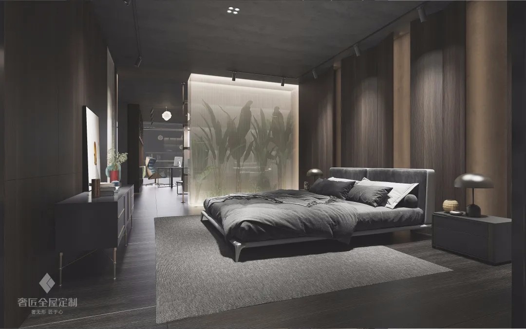 臥房通透大氣,整體配色以黑與灰為主色調(diào),配以煙熏橡木的木紋質(zhì)感,讓生活低調(diào)而不失高級(jí)感,綠植綴飾不僅增強(qiáng)了視覺觀感,也為臥房空間增添了一抹靈動(dòng)色彩。展示多元化的家居風(fēng)格,凝聚輕奢生活品質(zhì),展現(xiàn)極簡生活態(tài)度。