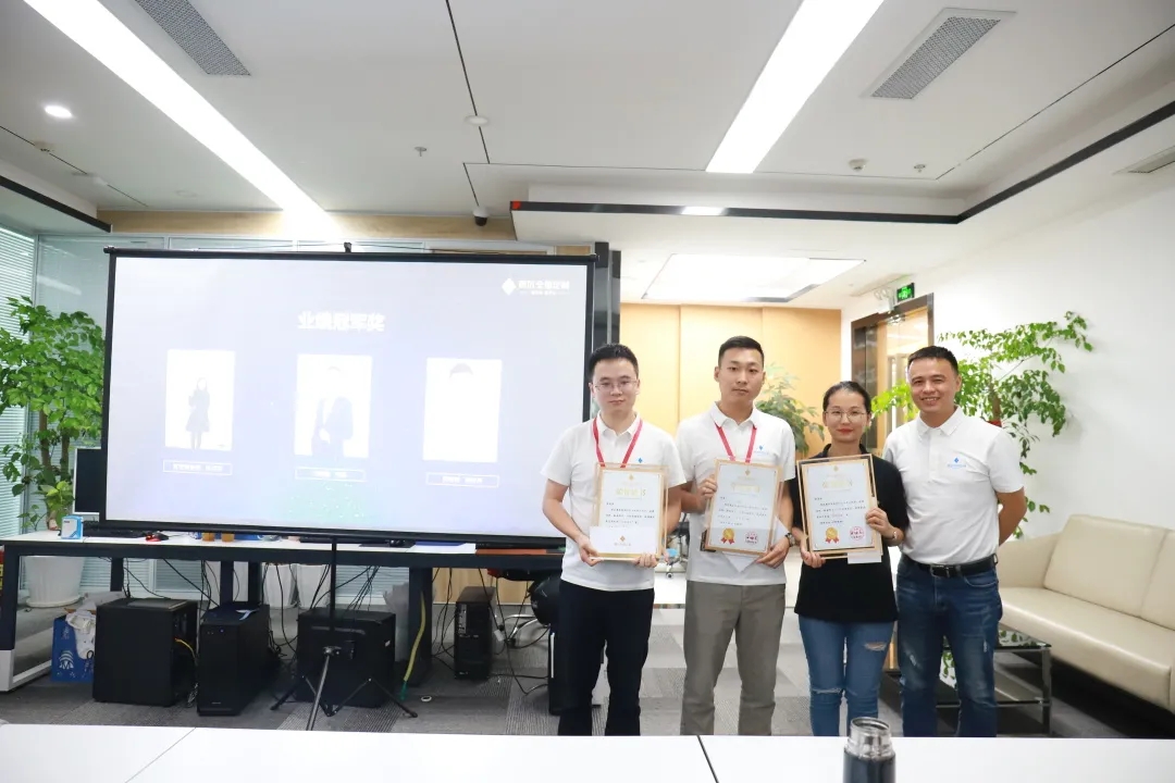 研發(fā)部經(jīng)理梁華波先生(右一)為主動(dòng)營(yíng)銷(xiāo)部黃飛(代領(lǐng))、直營(yíng)部曾宏洋、招商部牟治林頒獎(jiǎng)